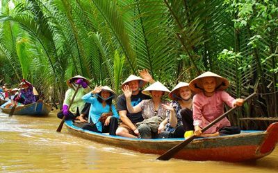 Arrivée à My Tho, embarquement à bord du bateau pour une belle excursion sur la rivière Tien jusqu'à Ben Tre au travers les fermes piscicoles, le marché aux poissons flottant le long de l'île du Dragon et le canal Xep à Ben Tre (pays des noix de coco) pour découvrir la fabrication des objets artisanaux du tronc et de la coquille de noix de coco.