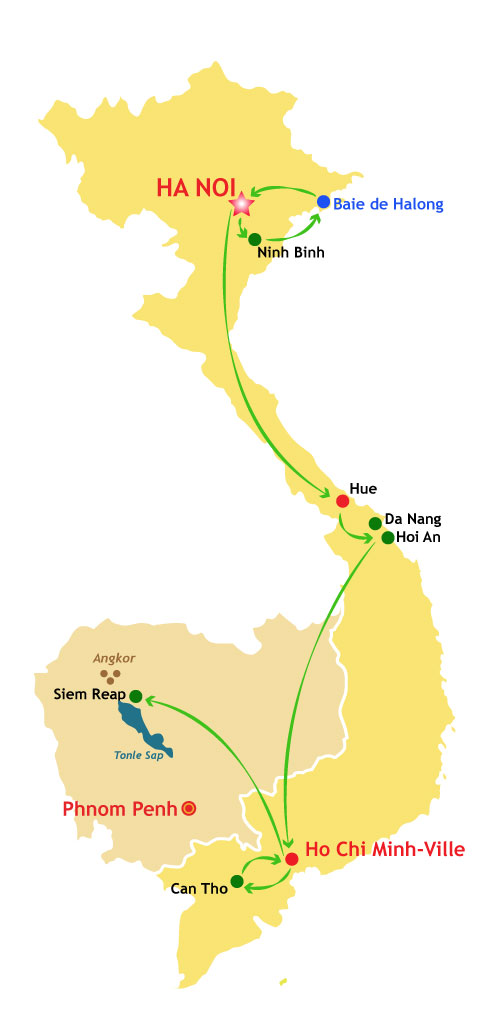 Circuit Vietnam Cambodge 15 jours en avion est un circuit combiné qui va à l’essentiel, sans pour autant sacrifier au confort des visites. Véritable condensé de trésors naturels, culturels et historique. Cet itinéraire dense part de la mythique baie d’Halong jusqu'aux marchés flottants du Delta du Mékong et se termine aux temples d'Angkor, en passant par l’ancienne cité impériale de Hue et la ravissante vieille ville de Hoi An. 15 jours, 4 sites inscrits à l‘UNESCO et la promesse de milliers de souvenirs impérissables.