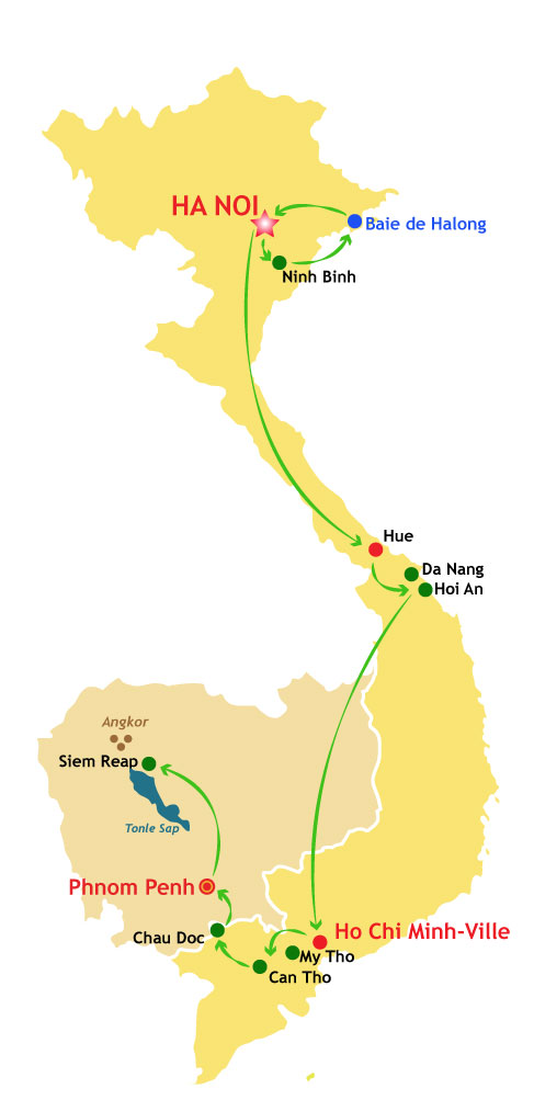 Ce circuit Vietnam-Cambodge 2 semaines vous permet tout d’abord de découvrir les sites majeurs du Vietnam, qu'ils soient culturels ou religieux, naturels ou historiques. Vous découvrirez le Pays du Dragon du Nord au Sud en rendant visite aux sites incontournables, pour finir votre voyage avec quelques jours au Cambodge, à l’ombre des fabuleux temples d’Angkor.